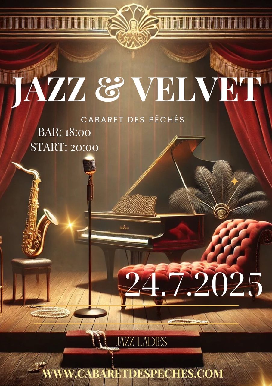 Velvet & Jazz je koncert, který vás vtáhne do světa sametu, třpytu a rytmů, které hladí duši. Je Nechte se unést podmanivými hlasy zpěvaček, jemnými tóny klavíru i pulzujícím rytmem kontrabasu, zatímco si vychutnáte lahodné koktejly v nádherném prostředí Cabaretu des Péchés.Těšit se můžete na hosty, kteří nejlépe reprezentují ženskost a šarm.