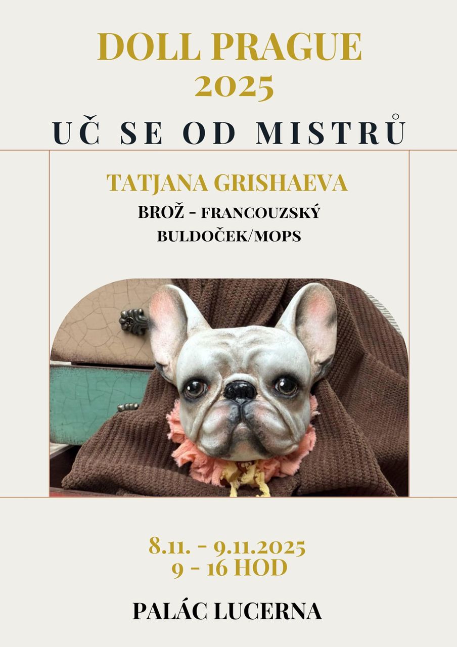 Pod vedením umělkyně Tatjany Grishaeva (LV) se během dvou dnů naučíte modelovat detailní hlavičku pejska ze samotvrdnoucí hmoty, nabarvíte ji technikou „suchého štětce“ a dozdobíte hedvábnou mašlí a zapínáním.