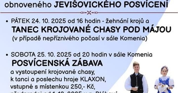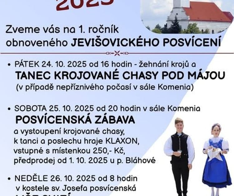 Podzimní posvícení v Jevišovicích odstartuje už v pátek večer tancem krojované chasy. V sobotu večer pak proběhne Posvícenská taneční zábava i s vystoupením krojované chasy. K poslechu i tanci zahraje od 20 hod. skupina KLAXON. Nedělní program zahájí hned ráno slavnostní mše v kostele.