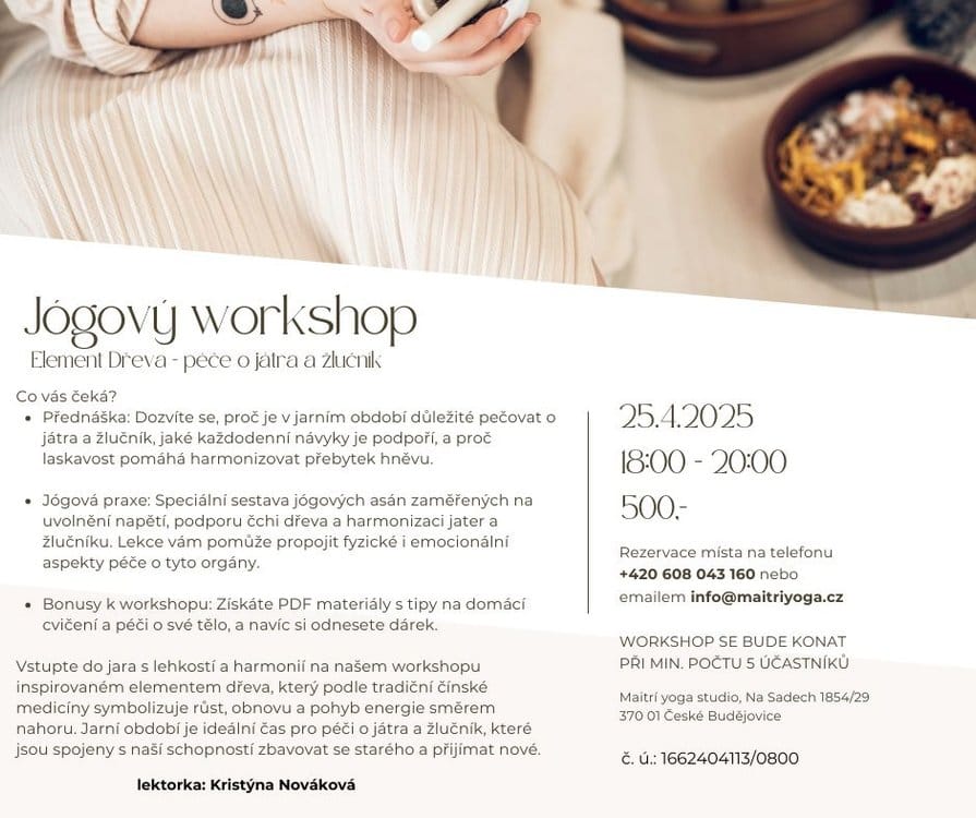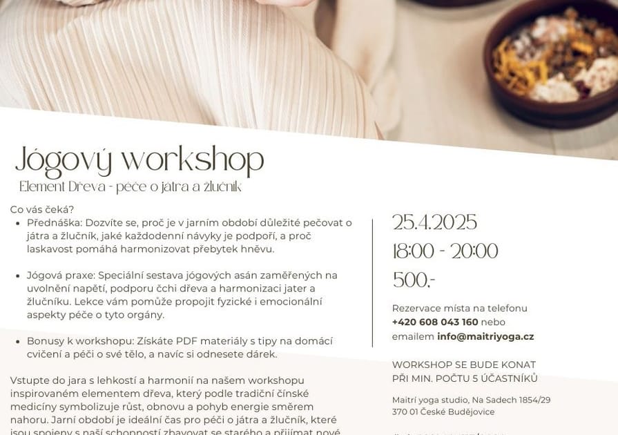 Vstupte do jara s lehkostí a harmonií na workshopu inspirovaném elementem dřeva, který podle tradiční čínské medicíny symbolizuje růst, obnovu a pohyb energie směrem nahoru. Jarní období je ideální čas pro péči o játra a žlučník, které jsou spojeny s naší schopností zbavovat se starého a přijímat nové.