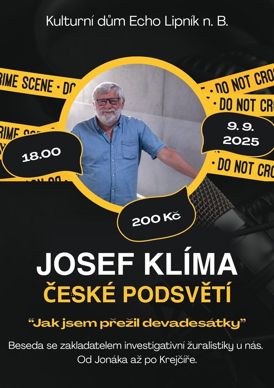Autor populárního pořadu „Jak jsem přežil devadesátky“, zakladatel investigativní žurnalistiky u nás Josef Klíma vypráví o divokých „devadesátkách“, o tom, jak se setkával s tehdejšími mocnými mafiány, od Jonáka až po Krejčíře, jak nebezpečné tehdy bylo být novinářem, ale i tom, jak se zločin mezitím proměnil a co hrozí dnešním mladým lidem.