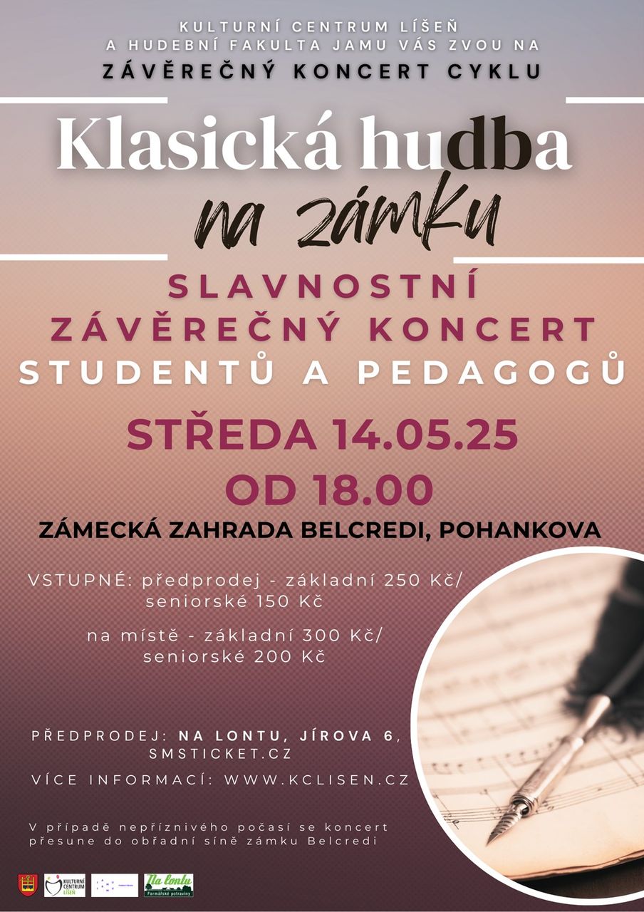 Závěrečný koncert se uskuteční na zámecké zahradě zámku Belcredi, Pohankova ulice, od 18 hod. V případě nepříznivého počasí se koncert přesune do obřadní síně zámku Belcredi, Pohankova ulice, od 18 hod.