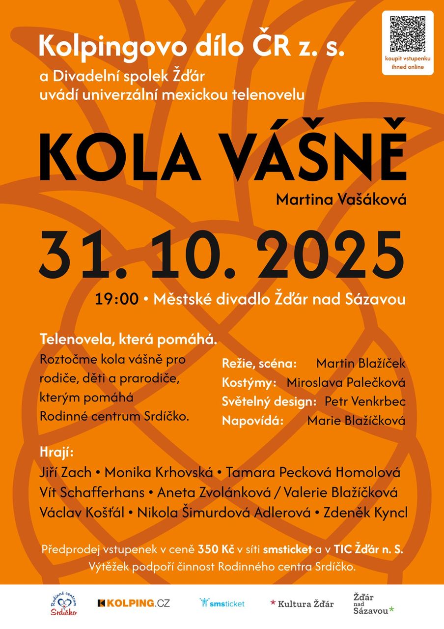 Kolpingovo dílo České republiky a Divadelní spolek Žďár zvou v pátek 31. 10. od 19:00 na premiéru představení KOLA VÁŠNĚ. Láska. Vášeň. Facky. Smích. Pláč. Intriky. Zrada. Rodinná tajemství. EMOCE. EMOCE. EMOCE. TO JSOU KOLA VÁŠNĚ!