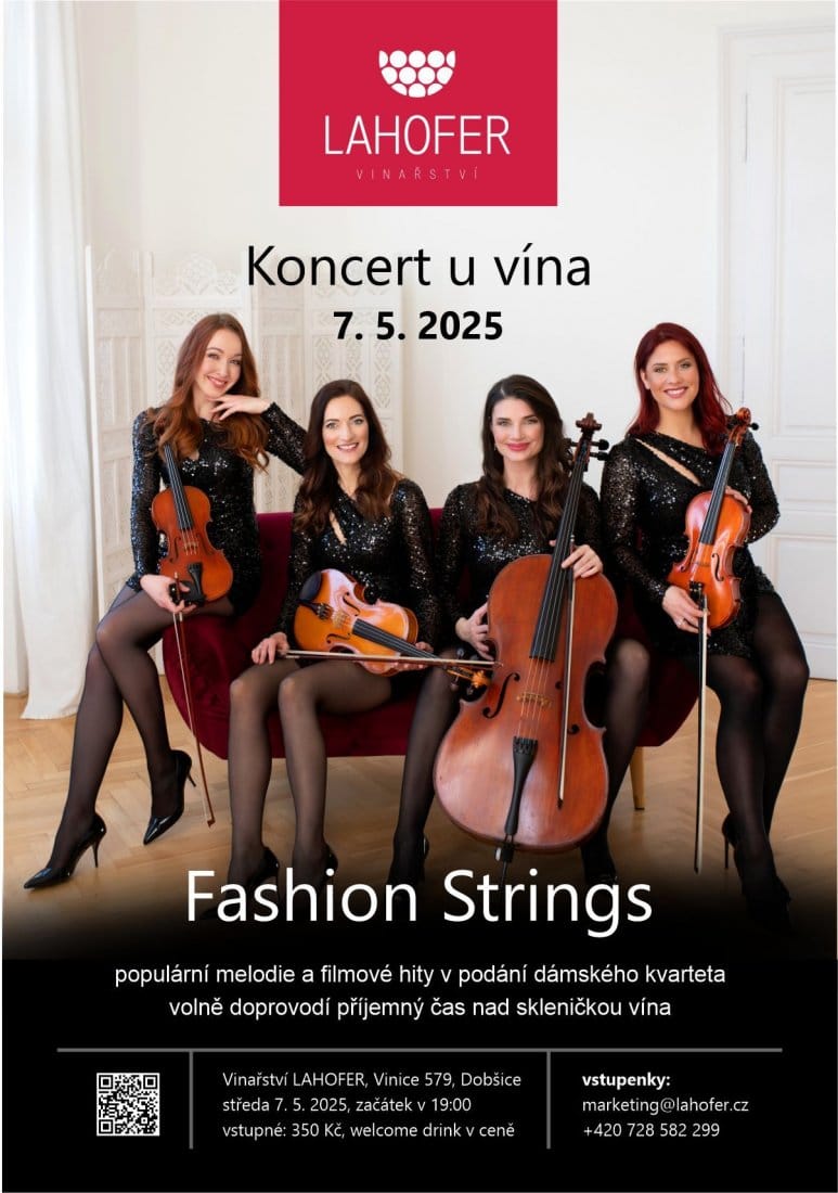 Ve středu 7. května se ve vinařství LAHOFER uskuteční unikátní koncert dámského kvarteta FASHION STRINGS. Jedinečnost večera spočívá ve volném propojení degustace vína dle vašeho výběru při poslechu populárních melodií a filmových hitů ve verzích upravených pro klasický smyčcový kvartet. Atraktivní a dynamické vystoupení dámského kvarteta FASHION STRINGS je dokonalou volbou živé zábavy. Jejich pestrý repertoár nabízí obrovský výběr nejznámějších světových hitů z oblasti popu, rocku, klasické hudby až k nejoblíbenější hudbě filmové.