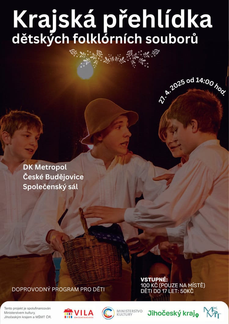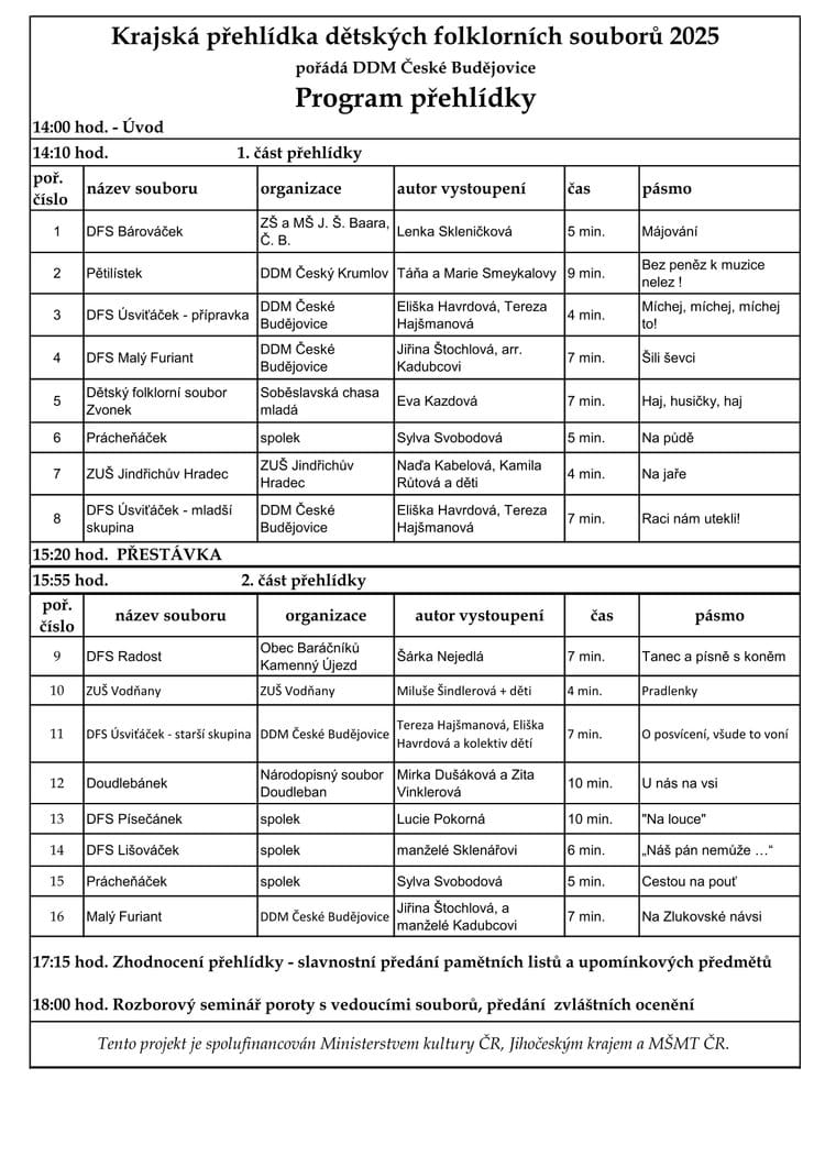 I letos bychom Vás rádi pozvali na jihočeskou krajskou přehlídku dětských folklorních souborů. Můžete se těšit na spoustu folklórních vystoupení s více než 300 účinkujícími a také doprovodný program pro děti.