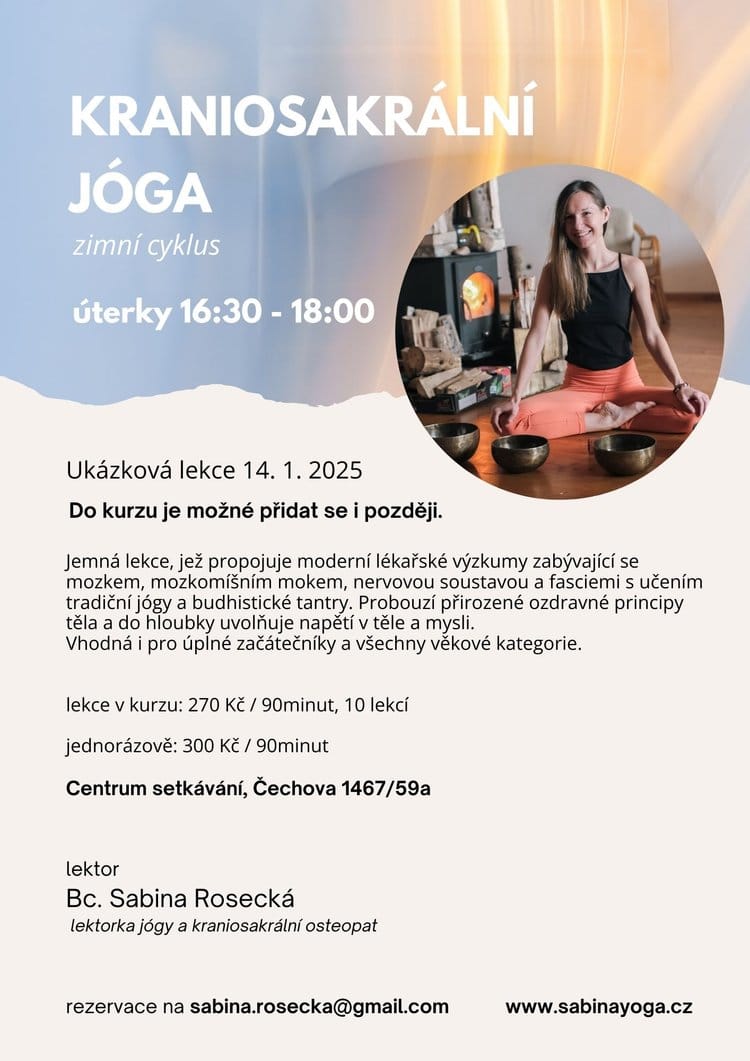 REZERVACE prosím předem na: sabina.rosecka@gmail.com Lektorka jógy SABINA ROSECKÁ, www.sabinayoga.cz, sabina.rosecka@gmail.com Její skupinové i individuální lekce vychází z tradiční hatha jógy, tibetské tantry a kraniosakrální osteopatie a biodynamiky. Součástí lekcí jsou techniky uvolnění těla a mysli a posilování funkční síly těla. Na společných setkáních vás vede k tomu, abyste vnímali svůj vnitřní prostor, pocity, energii a intuici. Naučili se komunikovat s tělem a respektovali ho. Více se dočtete na jejím webu.