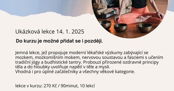Kraniosakrální jóga propojuje moderní lékařské výzkumy, zabývající se mozkem, mozkomíšním mokem, nervovou soustavou a fasciemi s učením tradiční jógy, tradiční čínské medicíny a buddhismu. Probouzí přirozené ozdravné principy těla a do hloubky uvolňuje fyzické i emoční napětí. Vhodná i pro úplné začátečníky. Můžete se kdykoliv přidat.