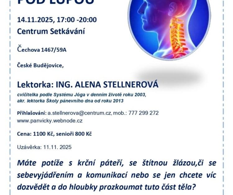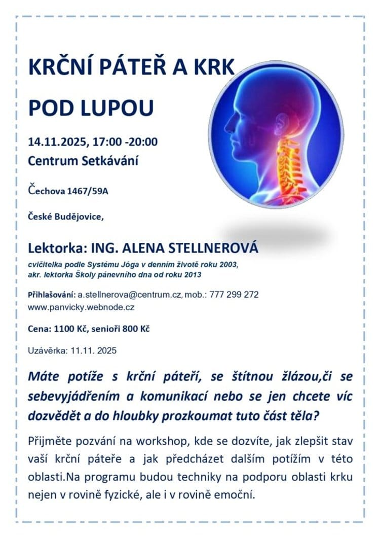 Přijměte pozvání na workshop, na kterém se dozvíte, jak zlepšit stav své krční páteře a jak předcházet potížím v této oblasti.