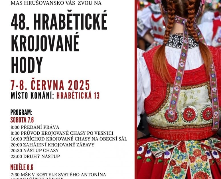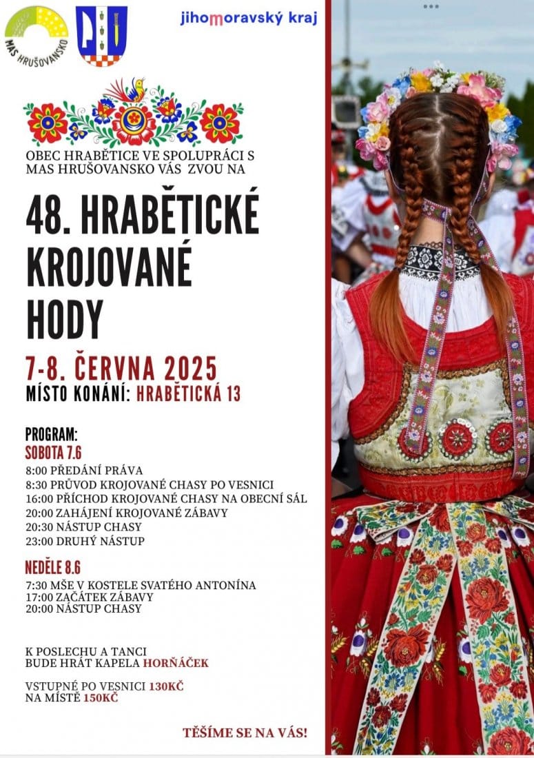Už 48. ročník krojovaných hodů v Hraběticích začne v sobotu 7. června od 8 hod. tradičním předáním hodového práva a průvodem krojované chasy po vesnici. Večer pak přijde na řadu tradiční hodová zábava. Nedělní program začíná mší v kostele sv. Antonína od 8 hod. a bude pokračovat tradičním průvodem chasy. Odpoledne od 17 hod. se opět můžete těšit na zábavu se závěrečným nástupem krojované chasy ve 20 hod.