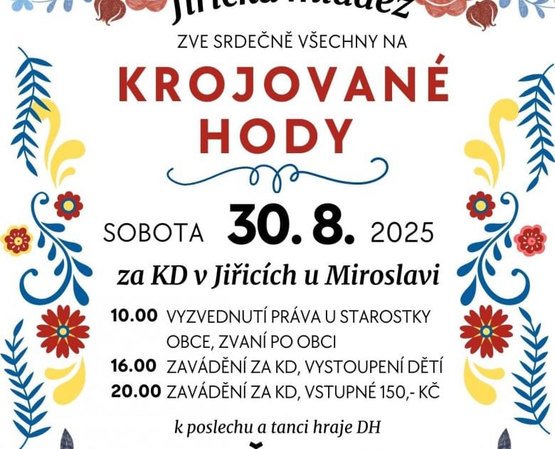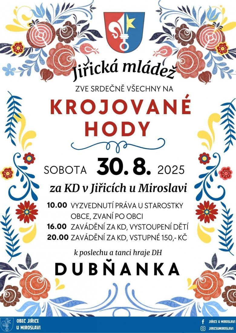 Tradiční krojované hody pořádá na konci srpna také Jiřická chasa společně s obcí Jiřice u Miroslavi. Program odstartuje již v 10 hod. vyzvednutím hodového práva a průvodem napříč obcí. Na večerní zábavě, která započne v 20 hod., zahraje Dechová hudba DUBŇANKA.