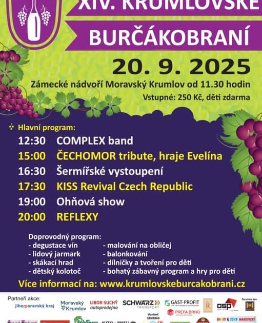 Tradiční podzimní slavnosti vína ve všech jeho podobách, hudby a zpěvu i gastronomických specialit na nádvoří renesančního zámku v Moravském Krumlově. Program 14. ročníku začne v 11:30 hod. a nabídne nejen čerstvý burčák a degustace vín, ale i lidový jarmark, dílničky, tvoření, hry a zábavu pro děti nebo pestrý hudební program.