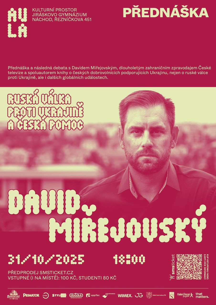 Přednáška a následná debata s Davidem Miřejovským, dlouholetým zahraničním zpravodajem České televize a spoluautorem knihy o českých dobrovolnících podporujících Ukrajinu, nejen o ruské válce proti Ukrajině, ale i dalších globálních událostech.
