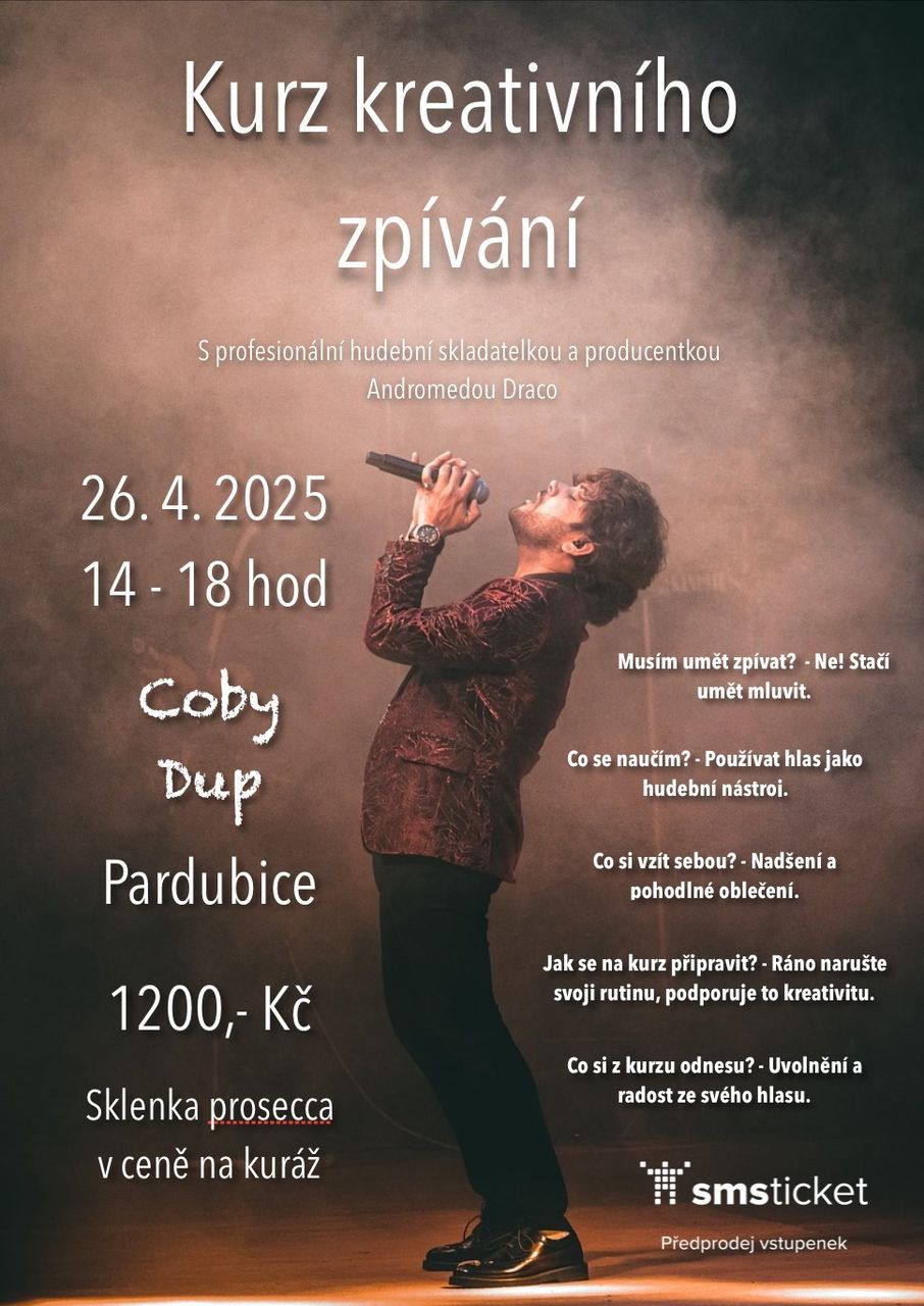 Zvu vás tedy na kurz, který z vás neudělá operní pěvce, ani vás nenaučí složité pěvecké techniky, ale podpoří vaši radost z vašeho osobního hudebního nástroje ve vašem hrdle. Cílem kurzu není začít s profesionální pěveckou kariérou, ale prohloubit radost a odvahu zpívat a hlavně se uvolnit a chvíli zapomenout na starosti každodenního života. Ale to není všechno. Naučíte se přes svůj hlas spontánně, kreativně ve skupině i samostatně skládat melodie a kdo ví, třeba to vyústí ve vaši vlastní hudební produkci, nebo fantastickou A capellu.