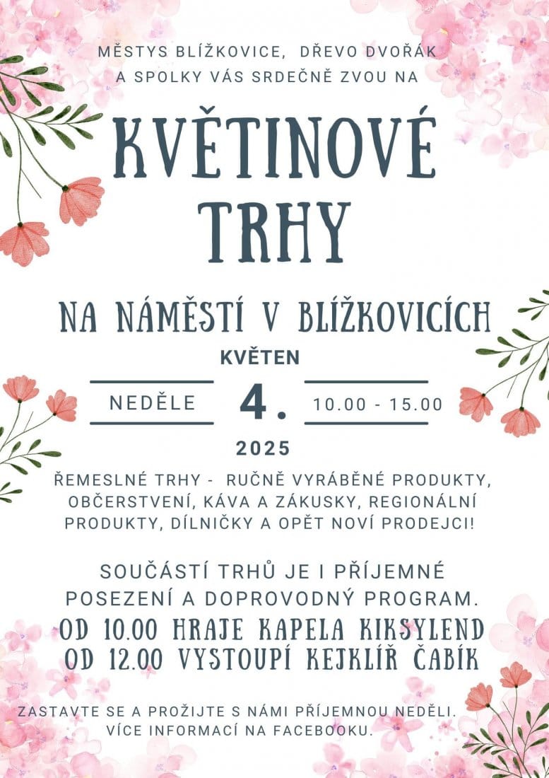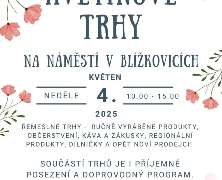 Náměstí v Blížkovicích zaplní od 10 do 15 hod. tradičně první květnovou neděli řemeslné trhy s ručně vyráběnými výrobky, kreativními dílničkami a bohatým občerstvením. Součástí trhů je i příjemné posezení s kapelou nebo kejklířské vystoupení. Vstup na akci je zdarma.