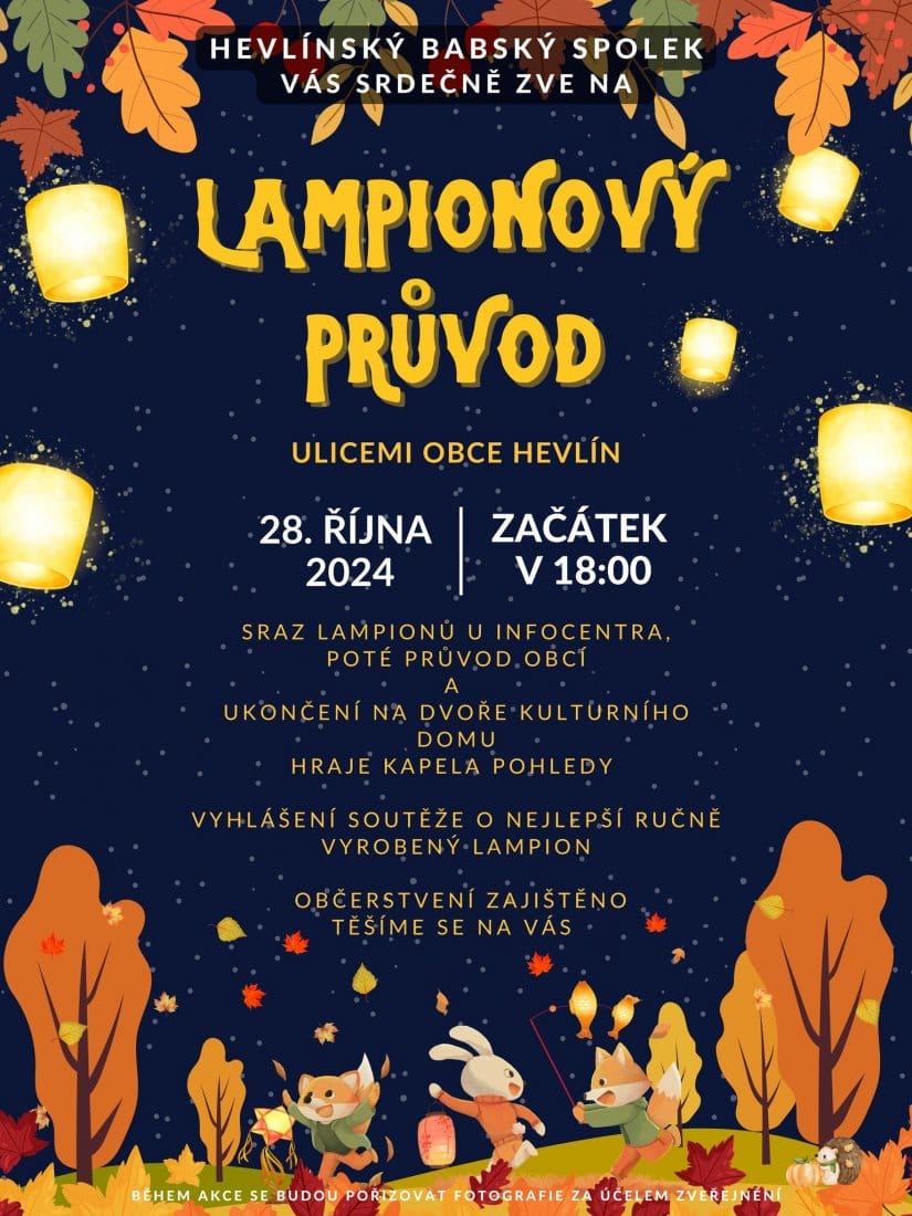 Vydejte se po setmění do ulic Hevlína s rozsvíceným lampionem – ten nejhezčí, vlastnoručně vyrobený, získá odměnu! Sraz účastníků je v 18 hod. na náměstí u informačního centra, odkud se světelný průvod vydá na trasu končící ve dvoře kulturního domu. Těšte se na hudební doprovod kapely Pohledy i na drobné občerstvení pro účastníky akce.
