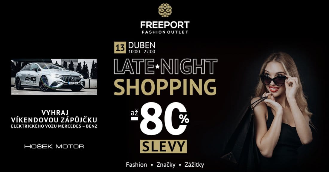 Užít si nákupy ve FRREPORT Outlet Centru na hraničním přechodu Chvalovice-Hatě, a to až do pozdních večerních hodin, můžete druhou dubnovou sobotu. Největší outletové nákupní centrum v ČR bude otevřeno od 10 do 22 hod. Kromě slev až 80 % a doprovodného programu máte navíc možnost vyhrát víkendovou zápůjčku elektrického vozu Mercedes-Benz.
