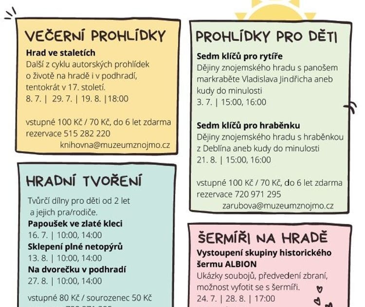 Přijďte si užít zábavný prázdninový program pro celou rodinu v prostorách Znojemského hradu, jednoho ze 6 objektů Jihomoravského muzea ve Znojmě. I letos Hradovánky nabídnou prohlídky pro děti, tentokrát na téma „SEDM KLÍČŮ PRO RYTÍŘE“, kdy Vás hradem provede sám markrabě Vladislav Jindřich. Čtvrteční prohlídky se konají v 15 hod. a v 16 hod.