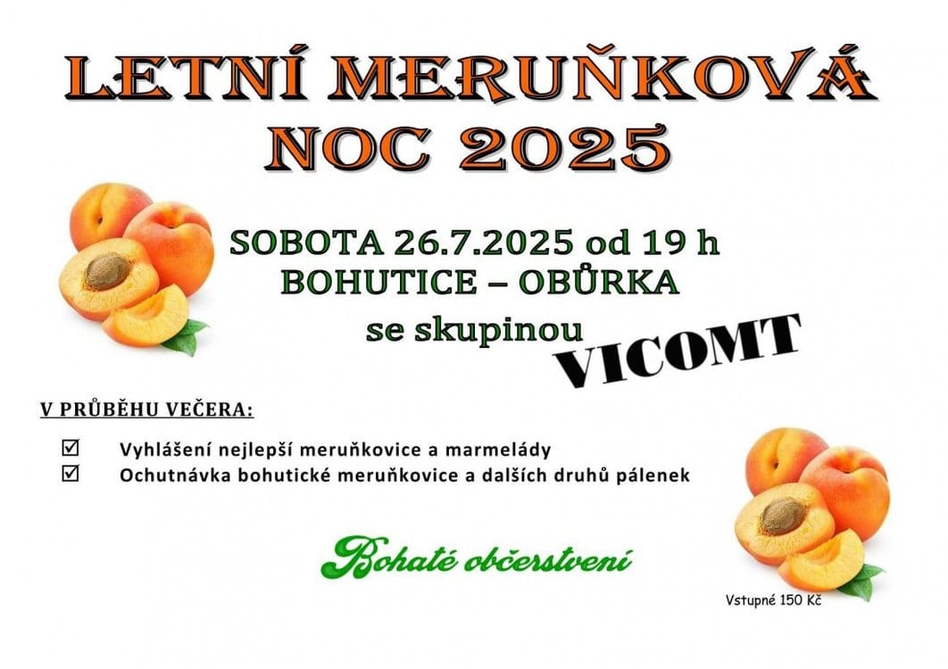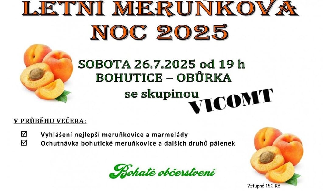 BOHUTICKÁ MERUŇKA je samostatná a oficiálně registrovaná odrůda meruněk, jejíž slávu si v Bohuticích každoročně připomínají. Letní zábava se soutěží o nejlepší meruňkovou marmeládu a ochutnávkou nejlepší meruňkovice (i dalších druhů ovocných pálenek), ale i dalším doprovodným hudebním programem proběhne v zámeckém areálu Obůrka. Během večera dojde i k vyhlášení vítězů soutěží a zajištěno bude také bohaté občerstvení.