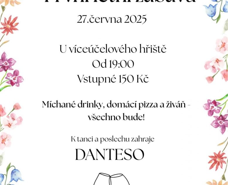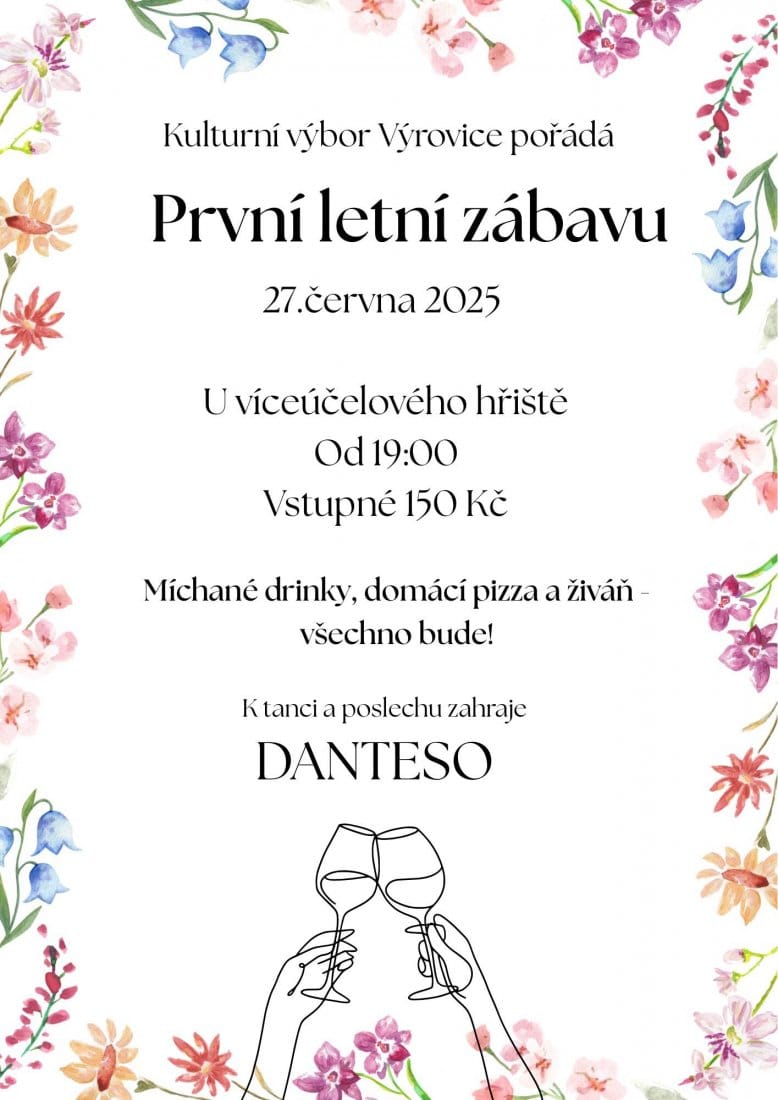 První letní zábava pod širým nebem si můžete užít ve Výrovicích u víceúčelového hřiště od 19 hod. K tanci i poslechu zahraje Danteso a k utišení hladu i žízně budou připraveny míchané drinky, domácí pizza nebo živáňská.