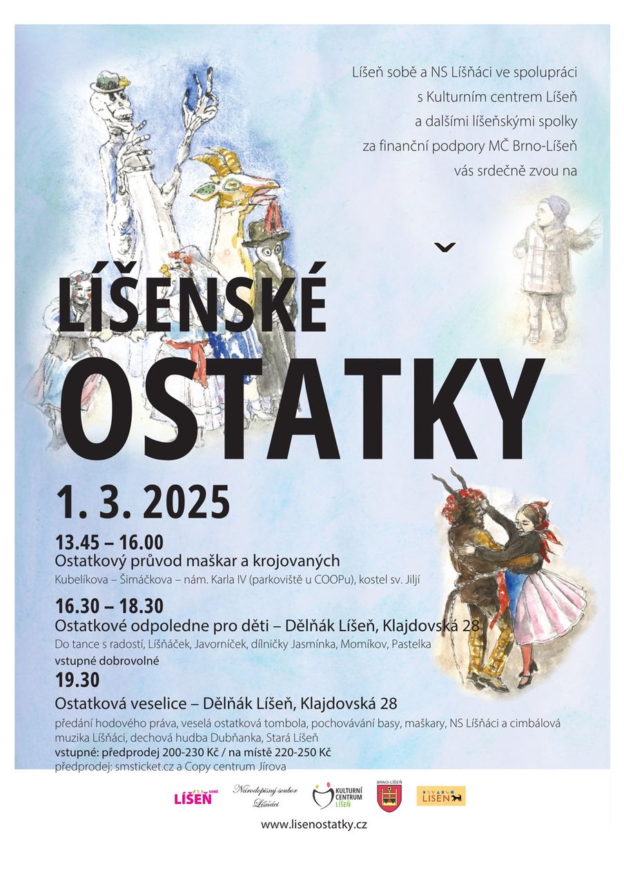 Vstupné 200 / 230 Kč. Předprodej na www.smsticket.cz. Více informací www.lisenostatky.cz, www.kclisen.cz a FB Líšeňské ostatky a kulturnicentrumlisen. Změna programu vyhrazena.
