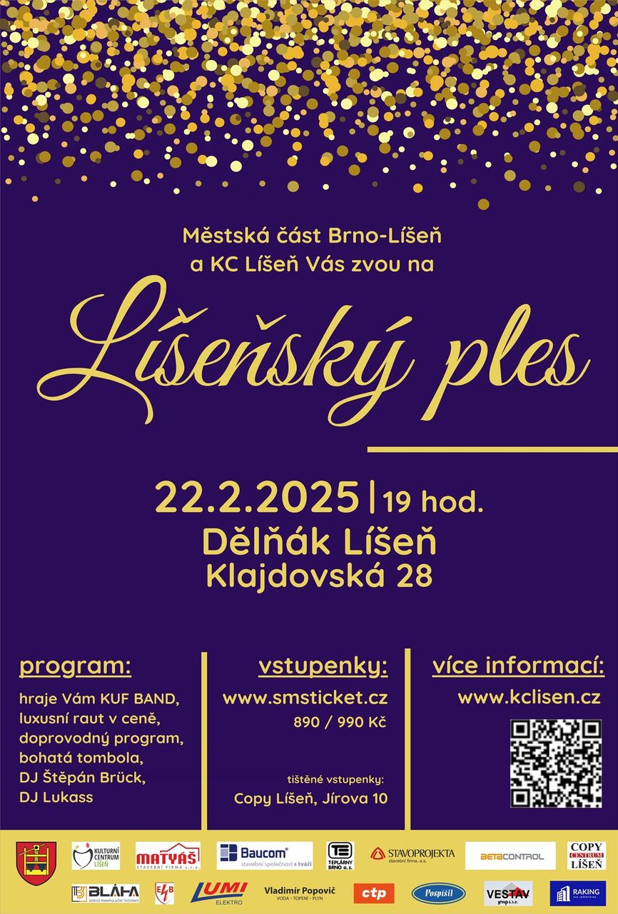 Srdečně Vás zveme na příjemnou akci nesoucí vypovídající název Líšeňský ples 2025. Uskuteční se pod patronátem starosty MČ Brno-Líšeň, Břetislava Štefana. Těšte se na vše, co můžete od tradičního slavnostního hřebu plesové sezóny očekávat.