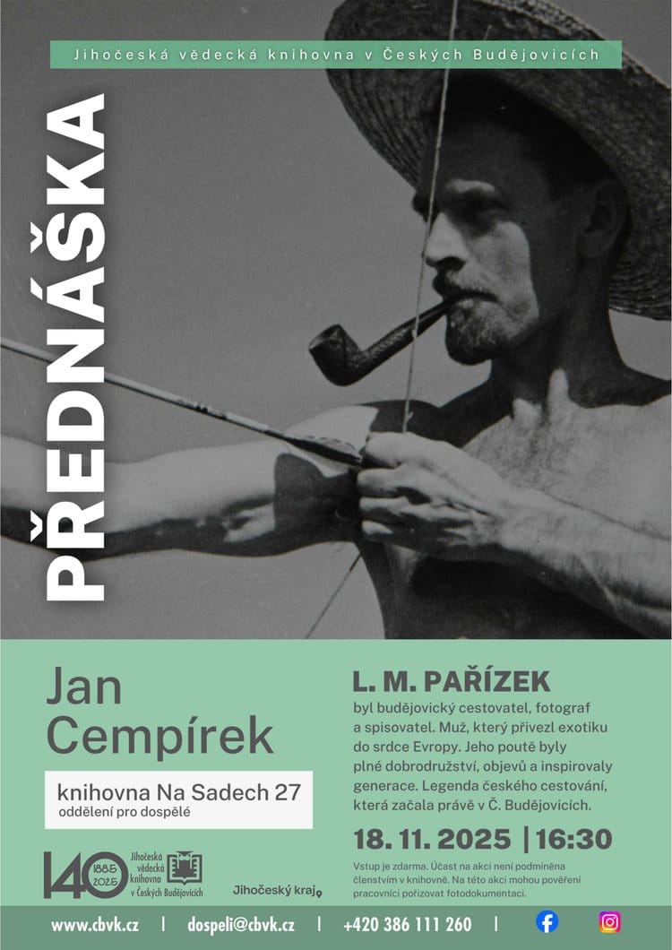 Budějovický cestovatel, fotograf a spisovatel – Ladislav Mikeš Pařízek. Muž, který přivezl exotiku do srdce Evropy. Jeho poutě byly plné dobrodružství, objevů a inspirovaly generace. Přednáší Jan Cempírek.