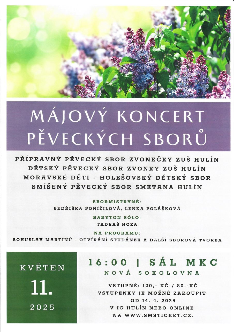 ZUŠ Hulín Vás srdečně zve na MÁJOVÝ KONCERT PĚVECKÝCH SBORŮ, který se uskuteční 11. května 2025 od 16:00 v sále MKC Hulín.