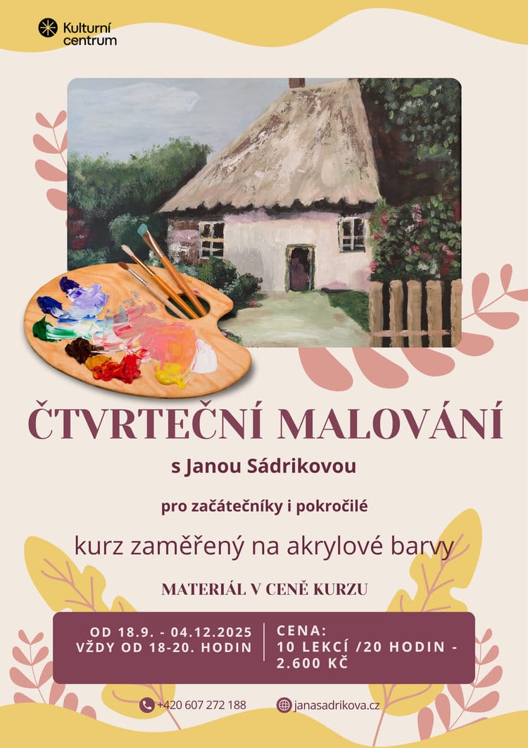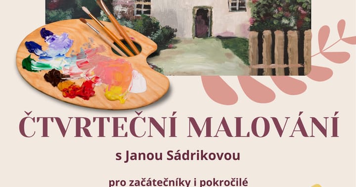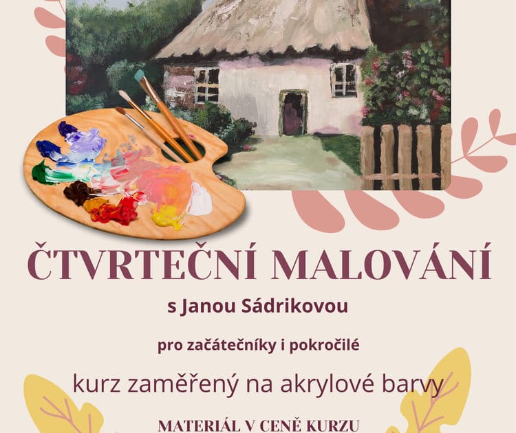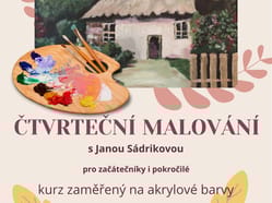 ČTVRTEČNÍ MALOVÁNÍLektor: Jana SádrikováZaměření: Akrylové barvy (pro začátečníky i pokročilé)Materiál: v ceně kurzu