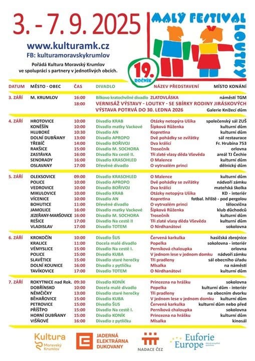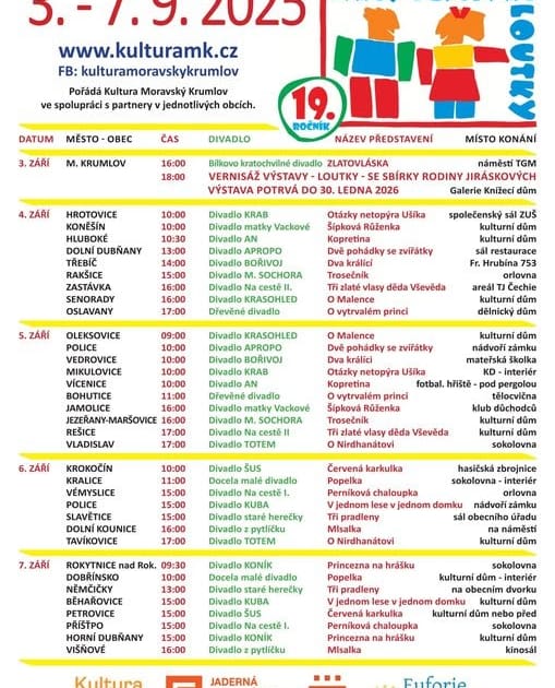 Čtyřdenní festival regionálních loutkových divadel – svého druhu unikátní v České republice. Už 19. ročník přehlídky současné loutkářské divadelní tvorby nejen v Moravském Krumlově, ale i v řadě okolních obcí, která se tradičně zaměřuje na pohádky pro nejmenší. Festival každoročně zpříjemňuje dětem konec prázdnin a začátek školního roku. Na jednotlivá představení je přitom vstup zdarma.