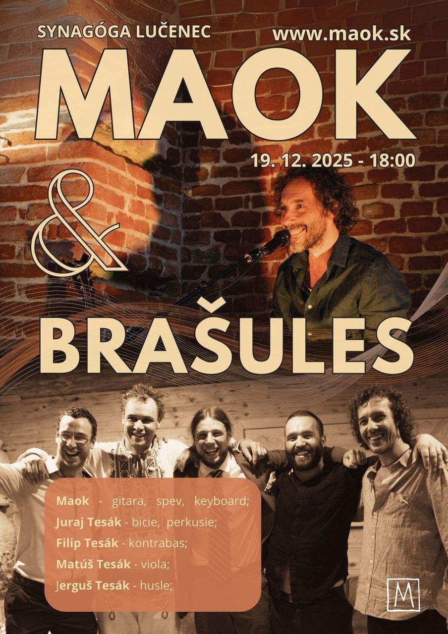 Pozývame Vás na Maokov koncert v Lučeneckej synagóge, kde Vám v prvej časti koncertu zahrá Maok svoje zvukomalebné melódie a k druhej časti prizve svojich štyroch bratov na pódium, spolu s ktorými zahrá známe ľudovky a možno aj svoje piesne.