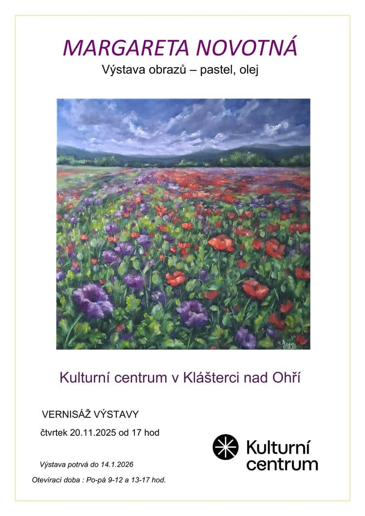 MARGARETA NOVOTNÁ – výstava obrazůPastel a olej na plátně v barvách, které pohladí duši. Přijďte se nechat unést krajinami plnými květin, světla a klidu.
