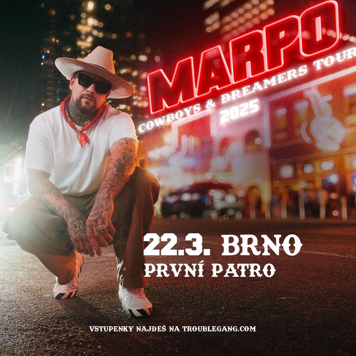 Rapper a zpěvák Marpo po 12 letech oznámil pauzu projektu TroubleGang a přichází s novým sólovým projektem, který do ČR přinese celosvětově velmi populární kombinaci moderního country a rapu. Žánrově tak naváže na své poslední album Cowboys & Dreamers, které je v recenzích označováno jako dosud jeho textově i hudebně nejlepší. Přijďte se podívat na Cowboys & Dreamers tour a přesvědčte se, že novej Marpo rozhodně nepatří do starýho železa.