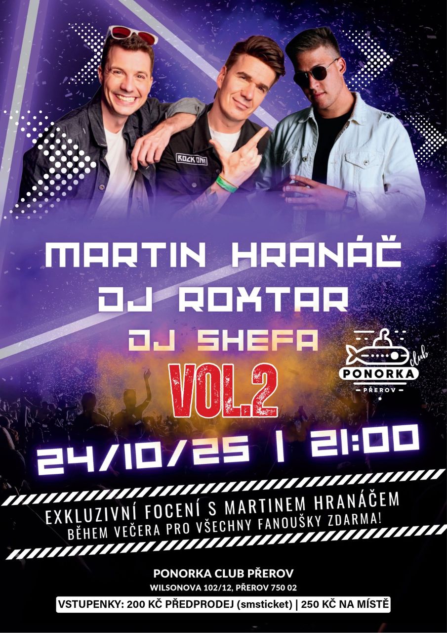 Populární duo Martin Hranáč & DJ Roxtar přijíždí v pátek 24. října na Ponorku do Přerova! Zahrají své společné hity, Martin opět zavtipkuje, pobaví a DJ Roxtar namixuje skvělé pecky pro každého z Vás!