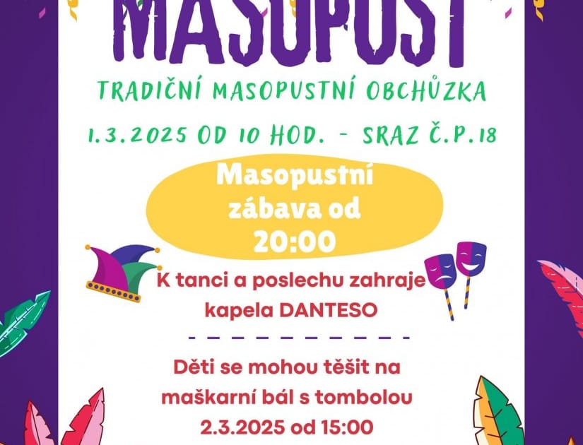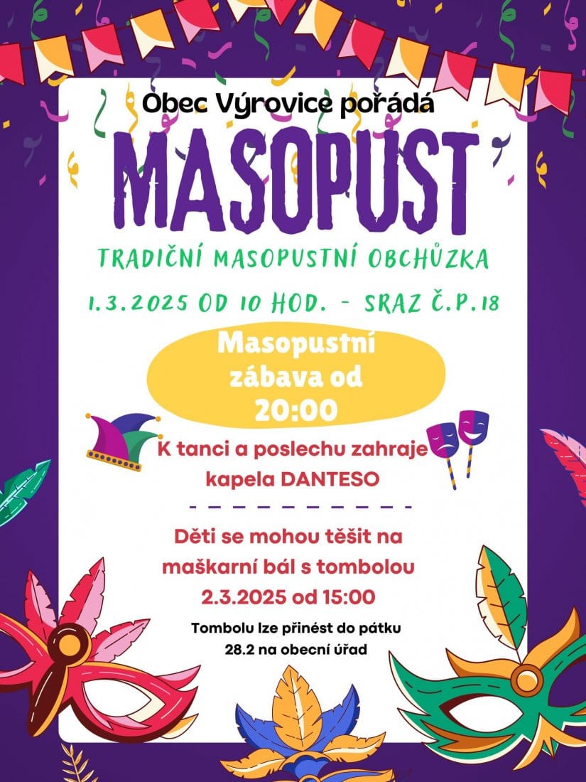 Tradiční masopustní veselí ovládne první březnový víkend i Výrovice. Nejprve v sobotu v 10 hod. vyrazí do ulic průvod rozpustilých masek a od 20 hod. spustí v místním kulturním sále kapela Danteso Masopustní taneční zábavu. V neděli zde pak čeká na děti od 15 hod. Maškarní bál.