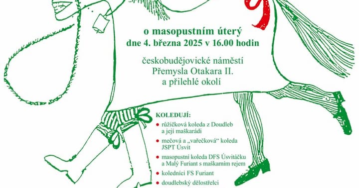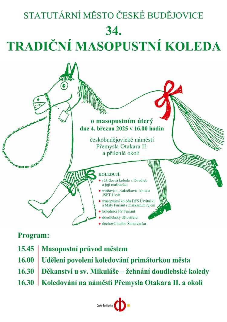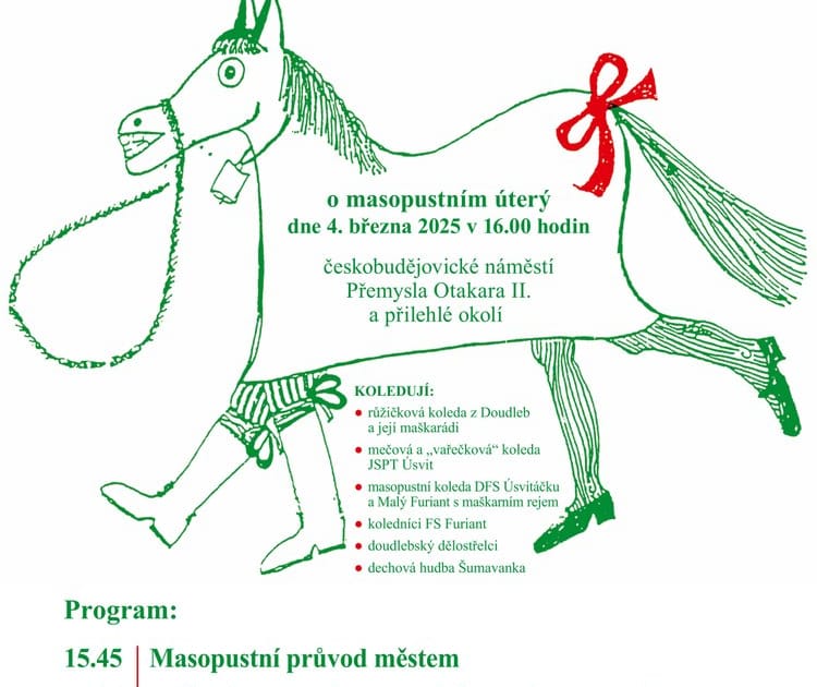 Průvod začíná u Jihočeského divadla a bude pokračovat tradičně na náměstí Přemysla Otakara II., kde se odehraje celý program. Můžete se těšit na maškarní průvod barevných masek, žehnání koledy i pochválení Masopustu. Doprovodný program zajišťují ty nejlepší jihočeské folklorní soubory, jejichž umění a výkony vytvářejí z budějovického masopustu ojedinělou akci překračující hranice regionu.