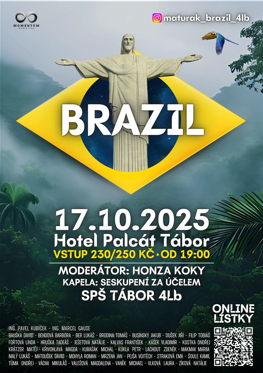Třída 4Lb vás všechny zve na maturák v rytmu Brazílie, kde společně prožijeme nezapomenutelnou noc plnou samby, barev a karnevalové energie! Připravte se na tropickou atmosféru a vášeň, která roztančí celý večer!