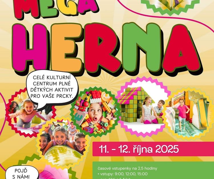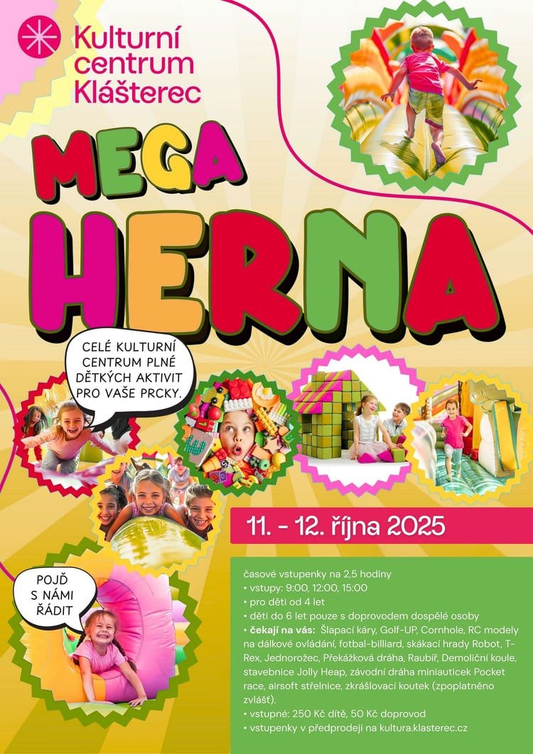Mega Hernu v Kulturním centru Klášterec si užijete 11.–12. října 2025. Čeká vás celé centrum plné dětských aktivit – šlapací káry, Golf-UP, Cornhole, RC modely na dálkové ovládání, fotbal-billiard, skákací hrady Robot, T-Rex, Jednorožec i Raubíř, překážková dráha, demoliční koule, stavebnice Jolly Heap, závodní dráha miniautíček Pocket race, airsoft střelnice a také zkrášlovací koutek (za poplatek zvlášť). Časové vstupenky platí na 2,5 hodiny s vstupy v 9:00, 12:00 a 15:00. Akce je určena pro děti od 4 let, děti do 6 let mohou přijít jen s doprovodem dospělé osoby. Vstupné činí 250 Kč za dítě a 50 Kč za doprovod. Vstupenky pořídíte v předprodeji na kultura.klasterec.cz.
