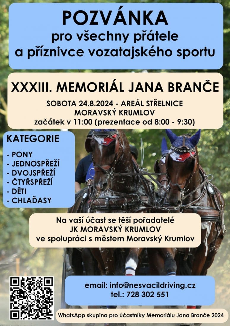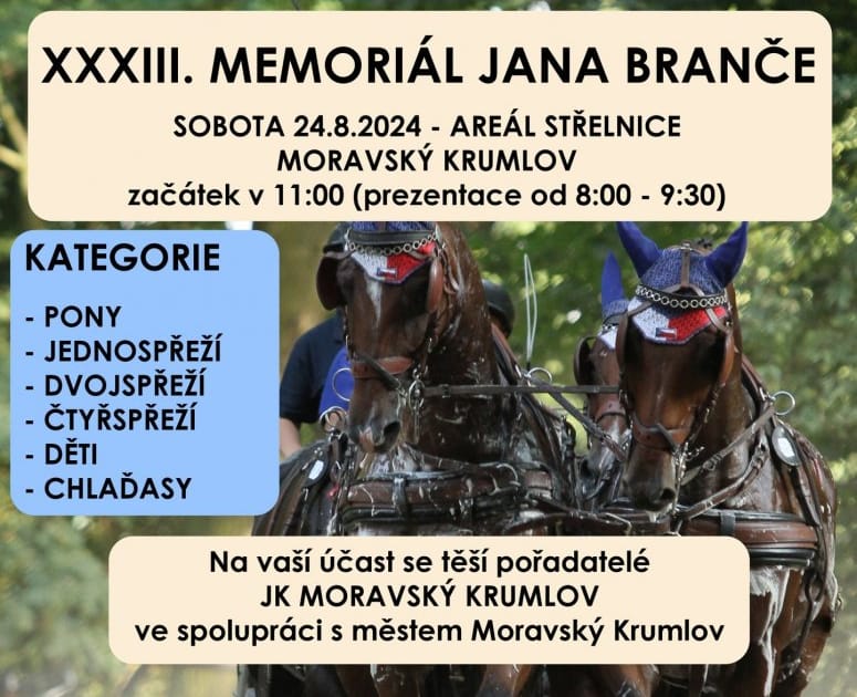 Milovníci koní si na konci prázdnin jistě nenechají ujít závody jezdeckých spřežení v areálu Střelnice v Moravském Krumlově. Už XXXIII. ročník Memoriálu Jana Branče zde odstartuje v 11 hod. Diváci se mohou těšit na kategorie pony, chladnokrevníci, jednospřeží, dvojspřeží i čtyřspřeží. Účastníky potěší krásné kokardy a poháry, ale i bohaté věcné ceny.