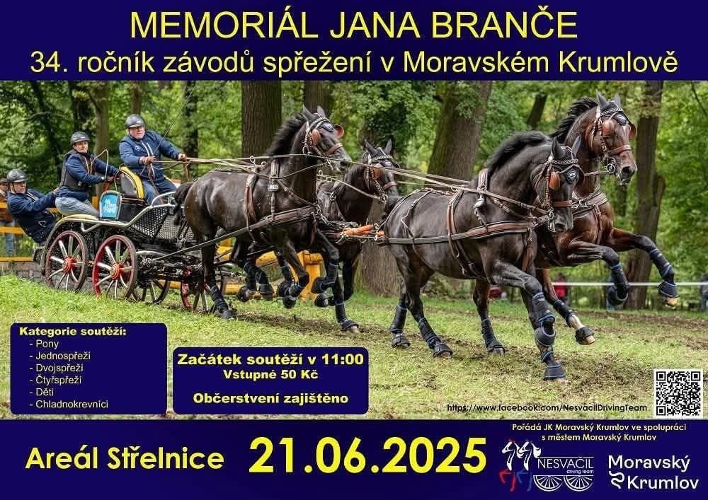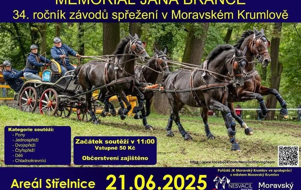 Milovníci koní si jistě nenechají ujít závody jezdeckých spřežení v areálu Střelnice v Moravském Krumlově. Už XXXIV. ročník Memoriálu Jana Branče zde odstartuje v 11 hod. Diváci se mohou těšit na kategorie pony, chladnokrevníci, jednospřeží, dvojspřeží i čtyřspřeží a nebude chybět ani dětská kategorie. Účastníky potěší krásné kokardy a poháry, ale i bohaté věcné ceny. Návštěvníky potěší podívaná na vozatajské umění, účastníky pak krásné kokardy a ocenění. Na místě bude připravena i možnost občerstvení.