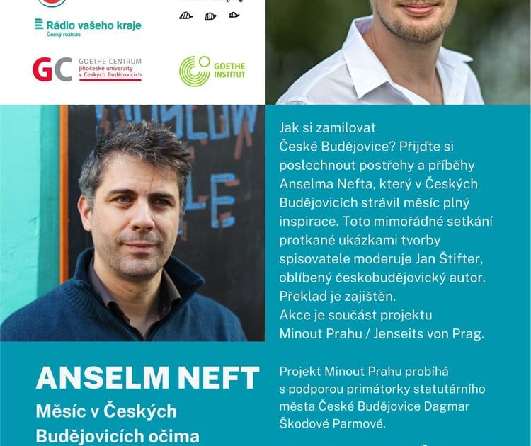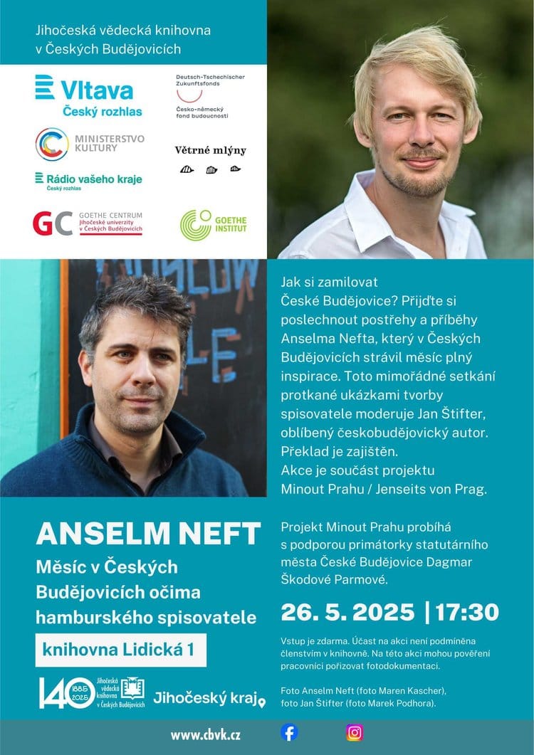 Jak si zamilovat České Budějovice? Přijďte si poslechnout postřehy a příběhy Anselma Nefta, který tu strávil měsíc plný inspirace. Toto mimořádné setkání protkané ukázkami tvorby spisovatele moderuje Jan Štifter, oblíbený českobudějovický autor. Překlad zajištěn. Součást projektu Minout Prahu / Jenseits von Prag. Těšíme se na vás v knihovně na Lidické.