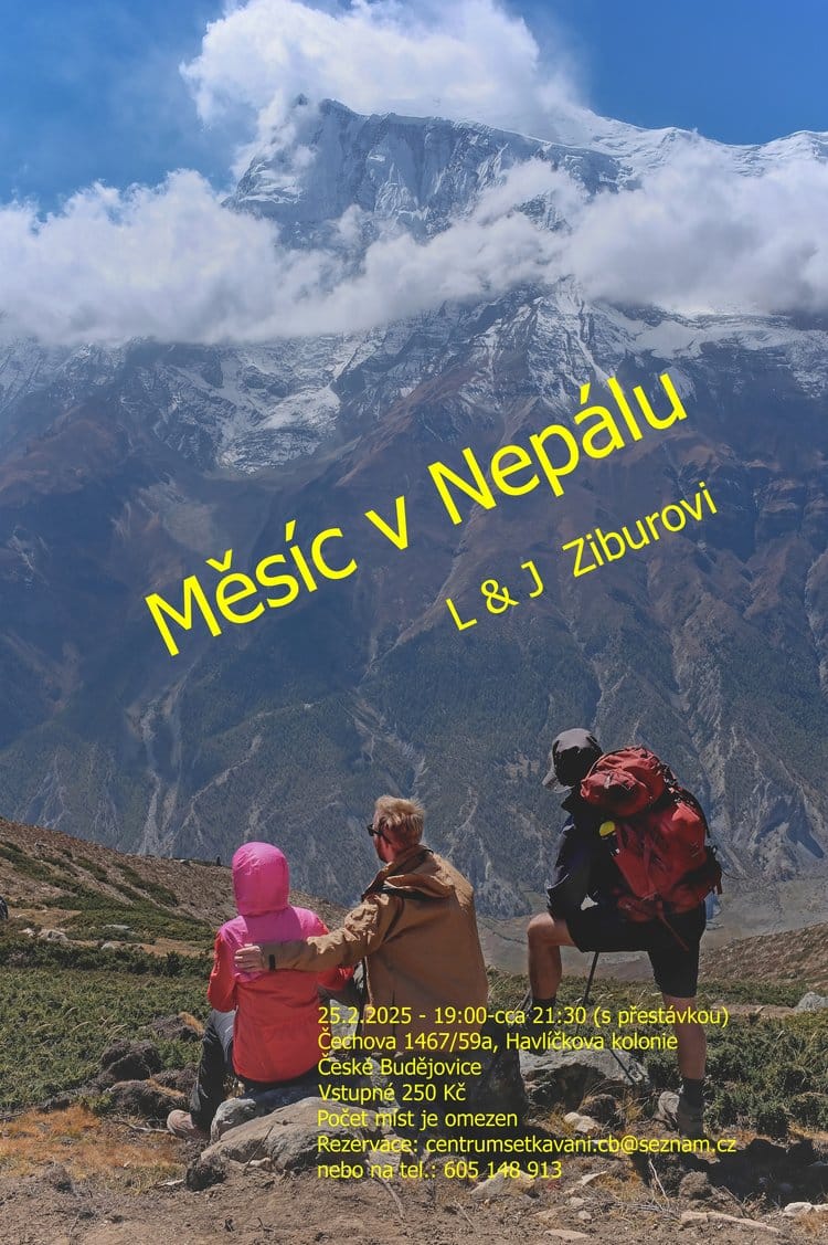 Rezervace prosím, předem: centrumsetkavani.cb@seznam.cz, ev.tel. 605 148 913 Cena: 250 Kč LADA a JIŘÍ ZIBUROVI, původním povoláním učitelé, dnes OSVČ. Kromě práce mají také zálibu v cestování. Cestu do Himálaje a národního parku Chitwan v Nepálu podnikli pod vedením svého mladšího syna Ladislava. Jsou důkazem toho, že cestovat se dá v každém věku, protože dosažení cíle je zpravidla jen otázkou motivace, zátěže a tempa.