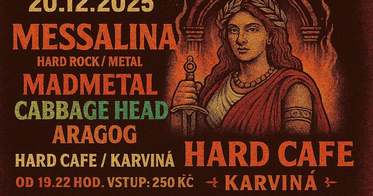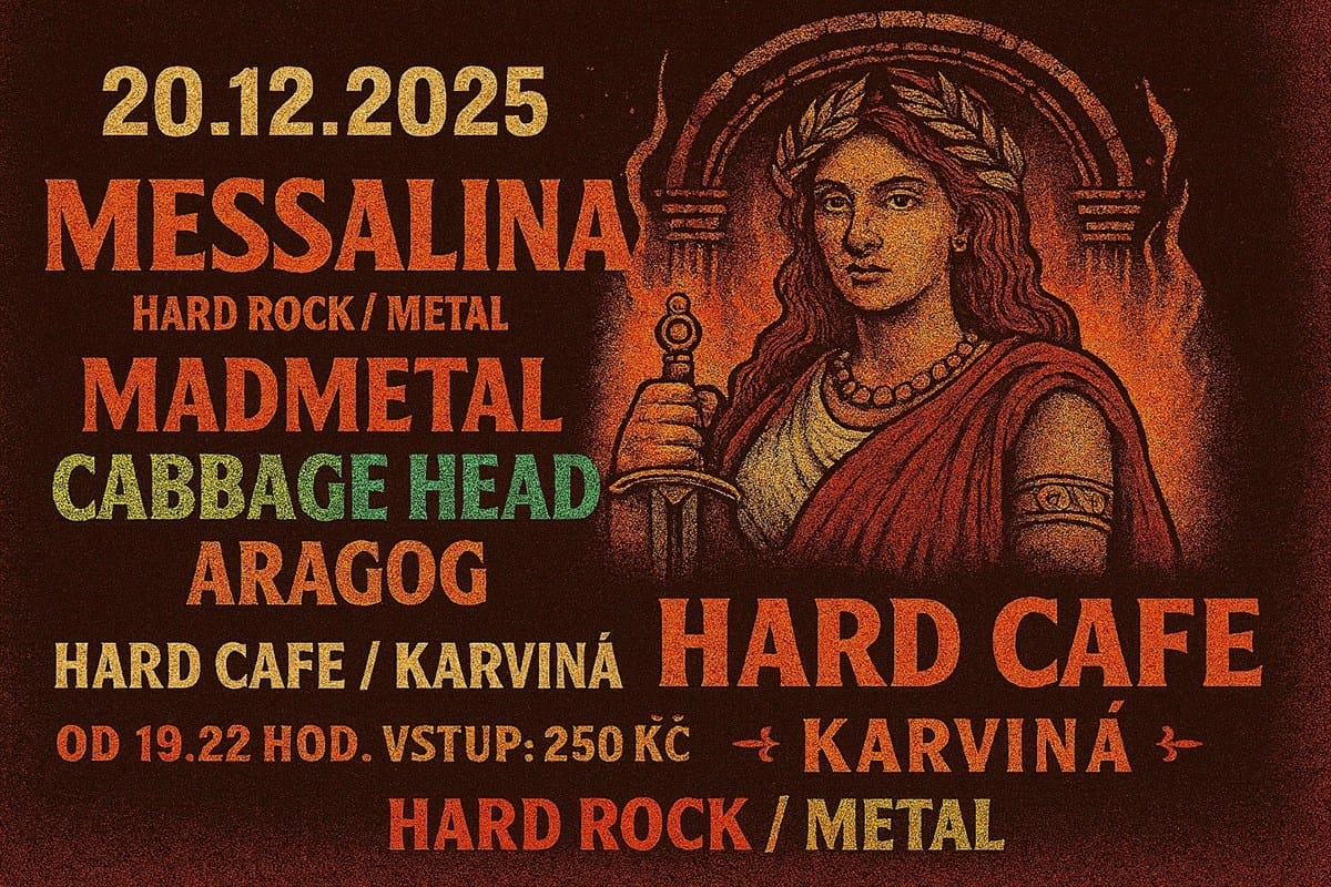 Messalina and young rock blood. Zveme vás na vánoční akci, která je tak trochu netradiční. Messalina se rozhodla pomoci mladým rockovým kapelám ke zviditelnění, protože ví, jak těžké je dostat se do českého hermeticky uzavřeného rockového „rybníčku“. Pozvali jsme zatím tři velmi mladé začínající kapely a věříme, že to bude silný hudební zážitek několika rockových žánrů – od extrémně tvrdé muziky až po melodický hardrock v podání právě zkušené Messaliny. Věříme, že posluchači rádi objevují nové talenty a že tuto zajímavou akci podpoří. Pozvali jsme karvinskou kapelu Madmetal, kde hrají dokonce dvě mladé démonické slečny. Dále rockovou školní kapelu – vycházející hvězdu Aragog z Třince, která hraje známé světové pecky. Další kapela je z Mníšku pod Brdy Cabbage head a ta nám nabídne takový industriální atmosférický metal. Nabídka je pestrá a tak se na vás budeme těšit, bez vás posluchačů a fans rockové muziky by to totiž nešlo. Děkujeme.