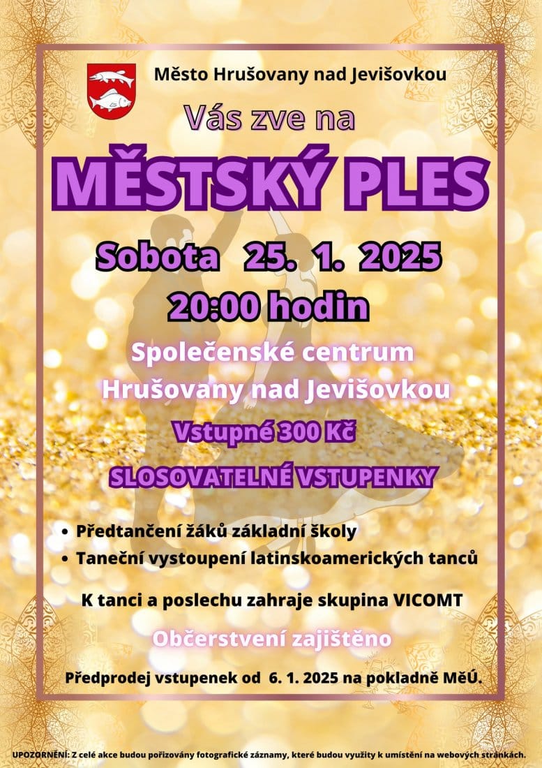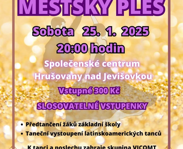 Přijďte si od 20 hod. do Společenského centra zatančit na slavnostní ples města Hrušovany nad Jevišovkou. Všechny vstupenky budou slosovatelné, k tanci i poslechu zahraje skupina Vicomt a o předtančení se postarají žáci ZŠ i profesionálové v rytmu latinskoamerických tanců.