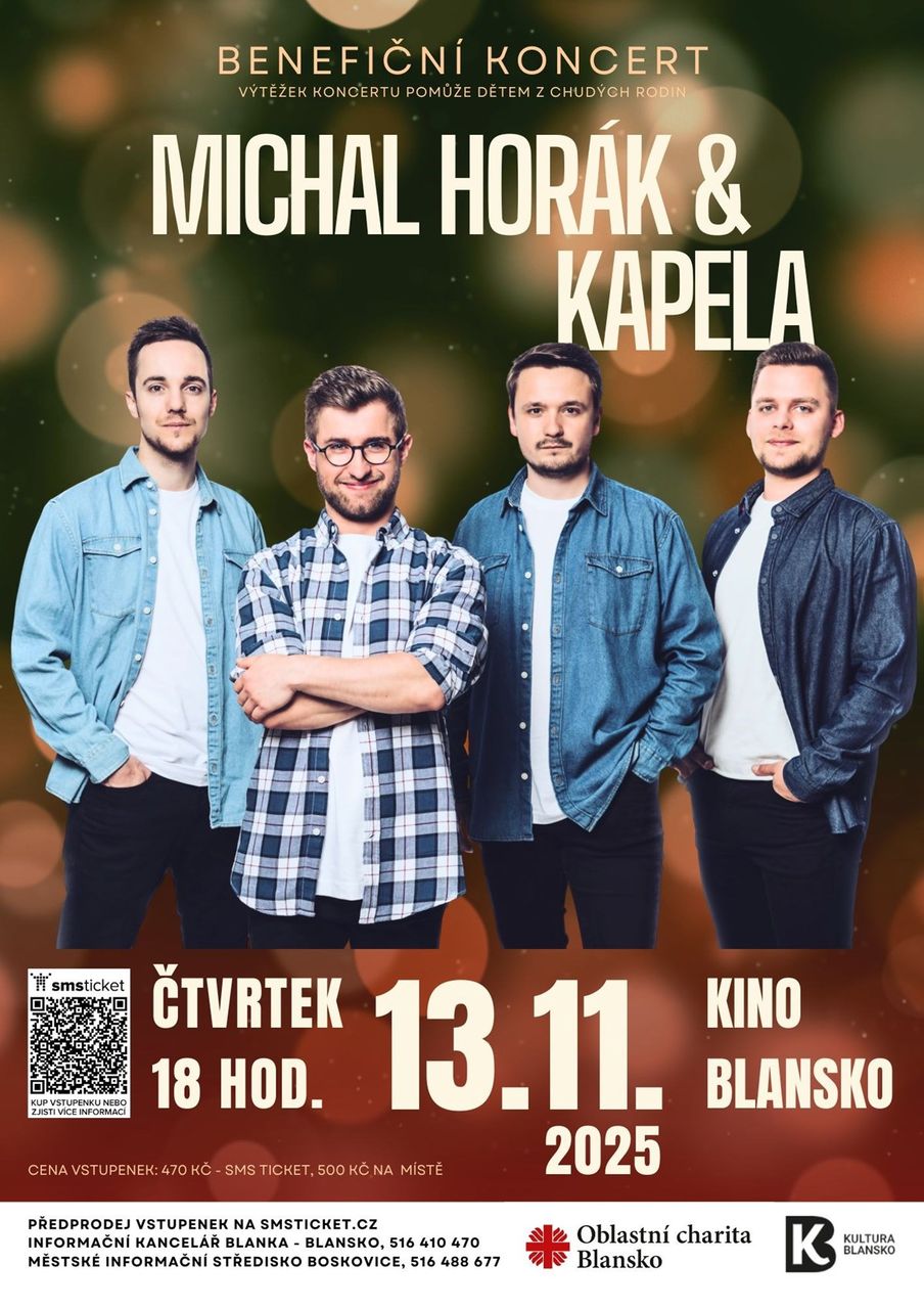 Benefiční koncert „Michal Horák & kapela“ ve čtvrtek 13.11.2025 v 18 hodin – kino Blansko.
