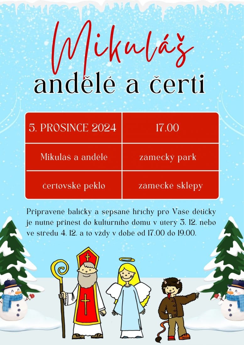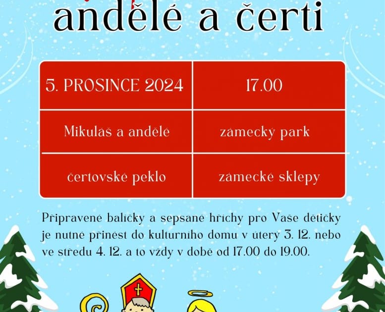 Mikuláš s čerty a anděly letos zavítá i do Miroslavi. Průvod Mikuláše (včetně jeho družiny čertů a anděla) bude vycházet v 16:45 hod. od zdravotního střediska směrem k Mateřské školce Pastelka. A zatímco Mikuláš a andělé budou na hodné děti čekat na dvoře MŠ, čertovské peklo se usídlí v zámeckých sklepích. Chybět nebude ani čertovský svařák a drobné občerstvení.