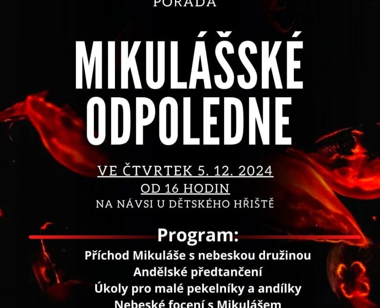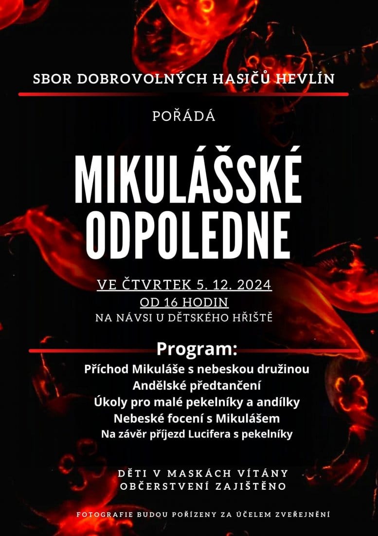 Náves u dětského hřiště v centru Hevlína ožije příchodem sv. Mikuláše s andělskou družinou, ale i Lucifera s pekelníky. Pro hevlínské děti budou připraveny soutěžní úkoly, nebeské focení a také drobné občerstvení.