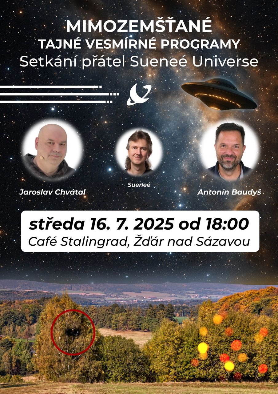 Zveme vás na setkání přátel a fanoušků zpravodajského serveru Sueneé Universe! Pojďme společně tvořit nový vesmír, setkat se u dobrého jídla v přátelské neformální atmosféře, sdílet zážitky ze setkání s ET. Téma: MIMOZEMŠŤANÉ A TAJNÉ VESMÍRNÉ PROGRAMY