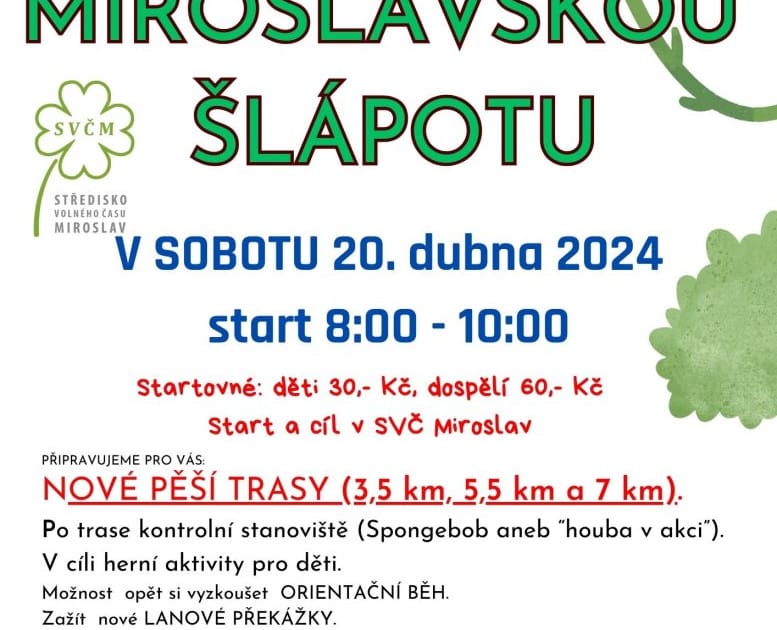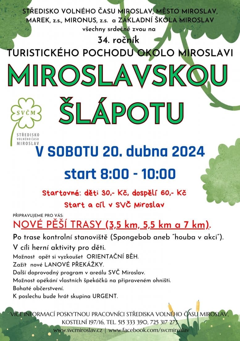 Tradiční turistický výšlap Miroslavská šlápota jarní přírodou, vedoucí okolím Miroslavi, je určen široké veřejnosti a každý z účastníků si může vybrat ze tří tras pro pěší dlouhých 3,5 km, 5,5 km nebo 7 km. Na trasách Miroslavské šlápoty bude několik kontrolních stanovišť, v cíli u Střediska volného času pak herní aktivity pro děti, doprovodný hudební program, občerstvení i oheň na opékání vlastních špekáčků. Těšte se také na lanové překážky nebo umožnost si vyzkoušet orientační běh.