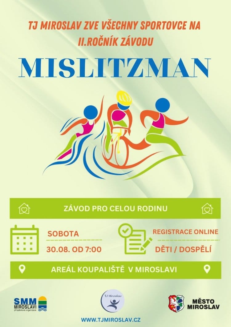 Zkuste si otestovat svou vytrvalost, sílu a sportovní nadšení. Rodinný triatlon MISLITZMAN 2025 se v Miroslavi koná již podruhé a soutěže se mohou účastnit dospělí i děti od 6 let. Mini verze Železného muže má opět tři sportovní disciplíny – plavání, cyklistiku a běh. Soutěž začíná již od 7 hod. na koupališti v Miroslavi. Registrace k závodu je možná již teď, a to na: https://forms.gle/YC8woWGuy1oTwd2YA