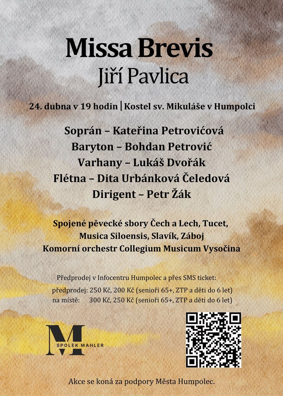 Zpěváci a hudebníci z Humpolce, Pelhřimova, Želiva a Pacova spojili své síly! Ve vzájemné spolupráci nastudovali opravdový hudební skvost. Ve čtvrtek 24. 4. od 19:00 hod. v kostele sv. Mikuláše v Humpolci bude mít publikum příležitost zhlédnout provedení překrásné skladby Missa brevis známého skladatele, zpěváka, houslisty a kapelníka Hradišťanu Jiřího Pavlici. Pod taktovkou Petra Žáka vystoupí spojené pěvecké sbory Tucet a Čech a Lech z Humpolce, Záboj z Pelhřimova, Slavík z Pacova a Musica Siloensis ze Želiva. Jako sólisté se představí Kateřina Petrovićová a Bohdan Petrović za doprovodu komorního orchestru hráčů našeho regionu Collegium Musicum Vysočina. Na varhany zahraje Lukáš Dvořák a na flétnu Dita Urbánková Čeledová. Tuto mimořádnou hudební událost připravil humpolecký Spolek Mahler za podpory města Humpolce. Přáním organizátorů je, aby se Missa brevis, nejen pro svou krásu a výjimečnost, stala trvalou součástí hudebního života našeho města a regionu. V neposlední řadě také tím, co spojuje příznivce hudby i její interprety.